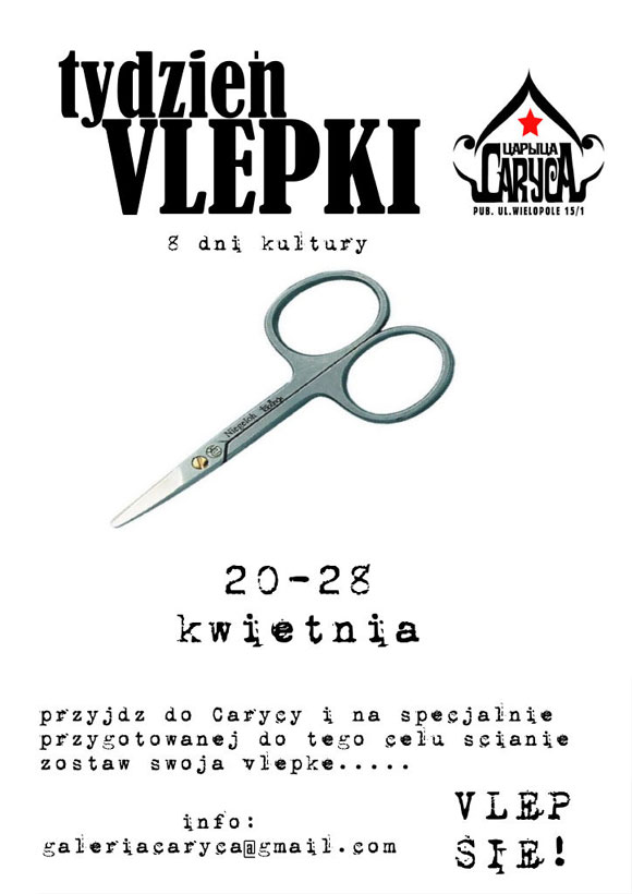 Między 20 a 28 kwietnia w ramach Festiwalu 8 Dni Kultury odbędzie się w Carycy Tydzień Vlepki. Wszystkich zajmujących się tworzeniem vlepek zapraszamy do prezentacji swojej twórczosci. Na specjalnie przygotowanej dla Was przestrzeni bedziecie mogli wlepiac ile wlezie! Weź udział w Tygodniu Vlepki pokaz swoja tworczosc innym i skonfrontuj ja z innymi.