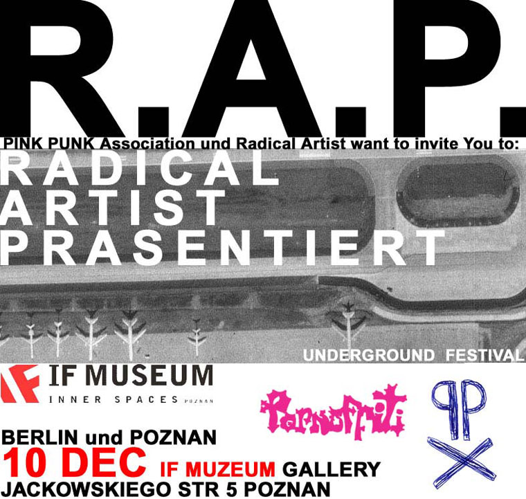 Pierwsza to wystawa artystów związanych, lub odwołujących się do Street Art'u. Druga impreza to przegląd filmów z Poznańskiego i Berlińskiego Underground'u. info grafy: 1 2(czarnobyla już niebawem vlep[v]net zaprezentuje :)) na forum skomentuj +++ Szczególy imprez na serwisie PinkPunk'u (http://free.art.pl/pinkpunk) ernioe |