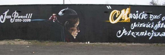 w lublińcu na ul. cebulskiego koło targowiska, na tylnej ścianie garaży wymalowano techniką graffiti twarz jana pawła II. autorem portretu jest damian malczewski. komentuj na forum: +++ vlep[v]net, na podstawie gazety wyborczej, foto z strony 3f ps. cieszymy się, że polski strit nie boi się komentować takich momentów i do tego tak różnie. |